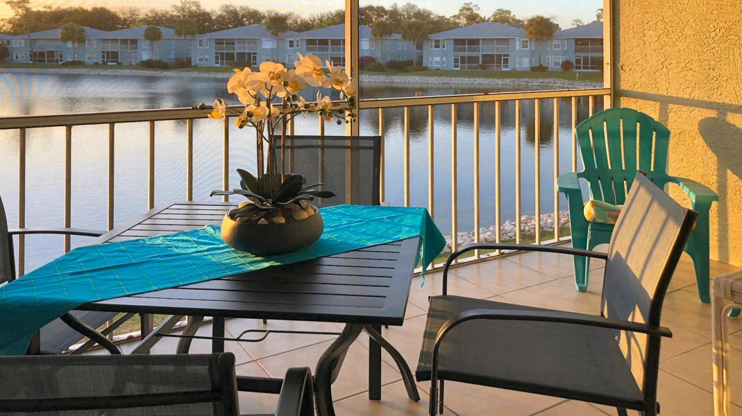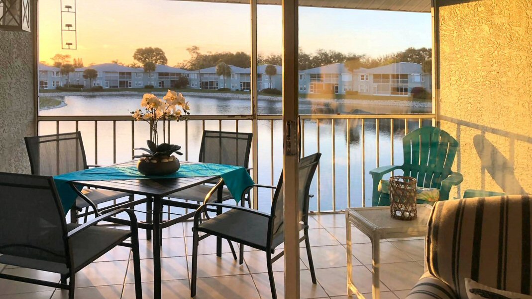Blick vom Balkon auf einen See. Nachmittags- und Abendsonne.