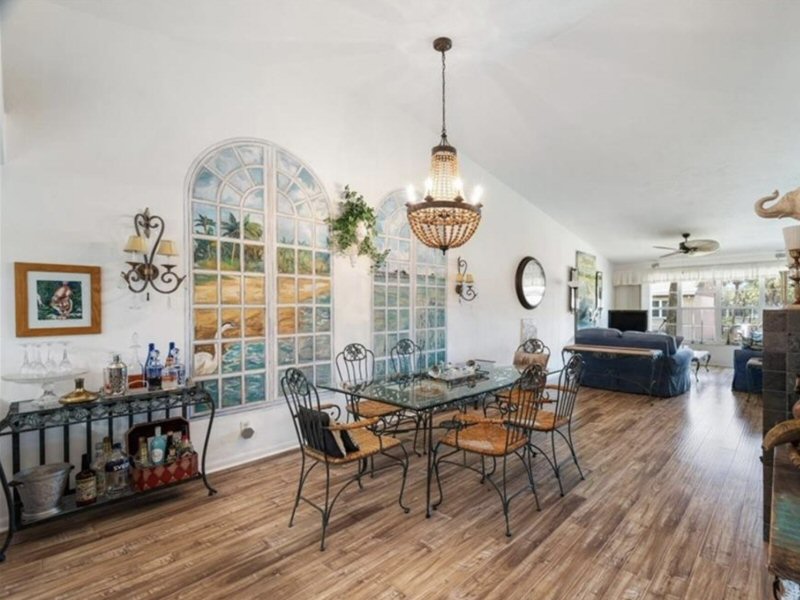Dining area. Wood finished floor, high vaulted ceiling, ceiling fan.