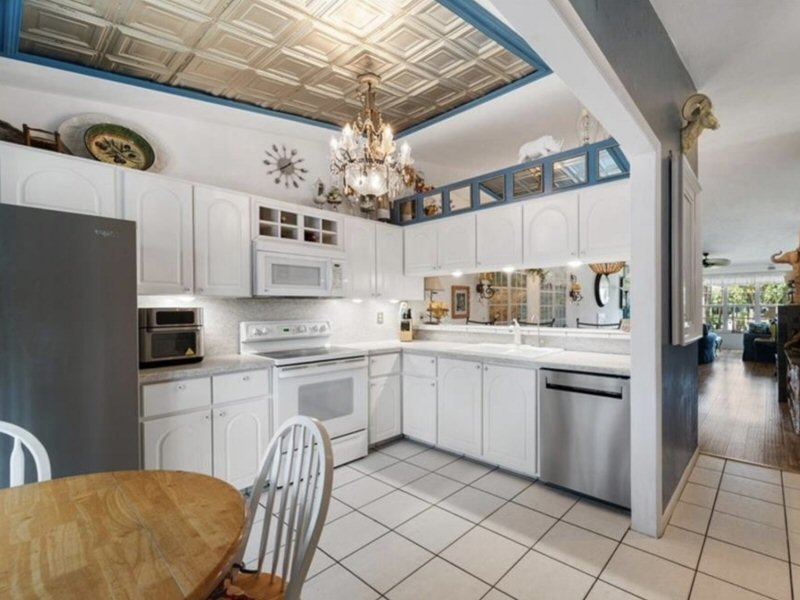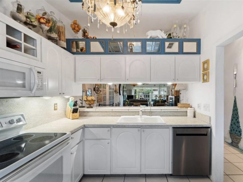Kitchen. Light tile patterned floor. Glass insert Cabinets.