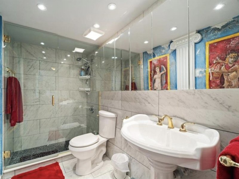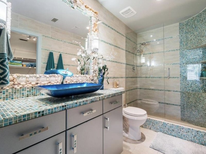 Bathroom next to Guest Suite with tile walls and floors, shower stall, recessed lightning.