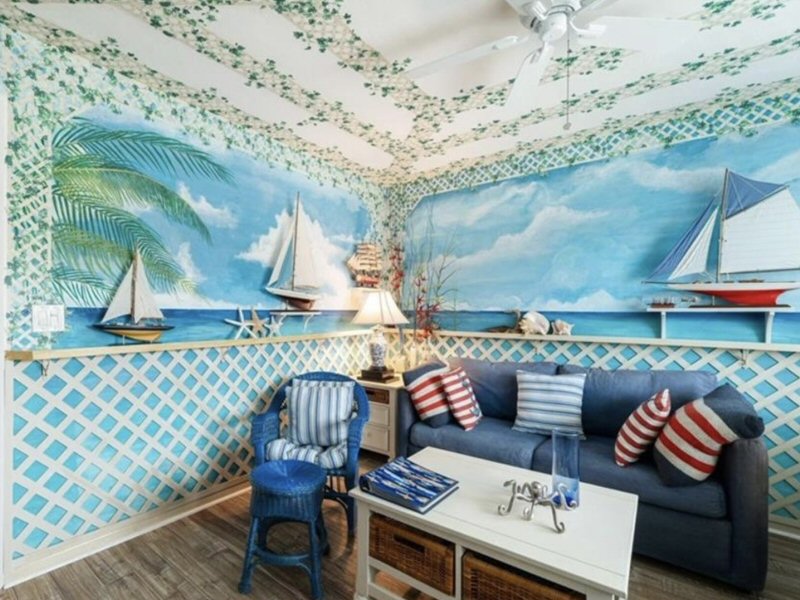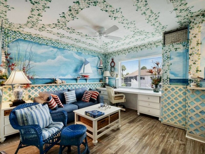 Living room with wallpapered walls, ceiling fan, wood finished floor.