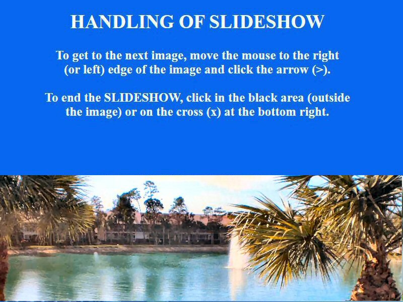 CLICK on picture to enlarge. Command Key F11 makes it even bigger. With the large picture a SLIDE SHOW is automatically activated. To go BACK and FORTH click on the LEFT or RIGHT side of the big picture. To finish the SHOW click on the darkened frame around the picture or on (x). Command Key F11 brings your screen back to normal.